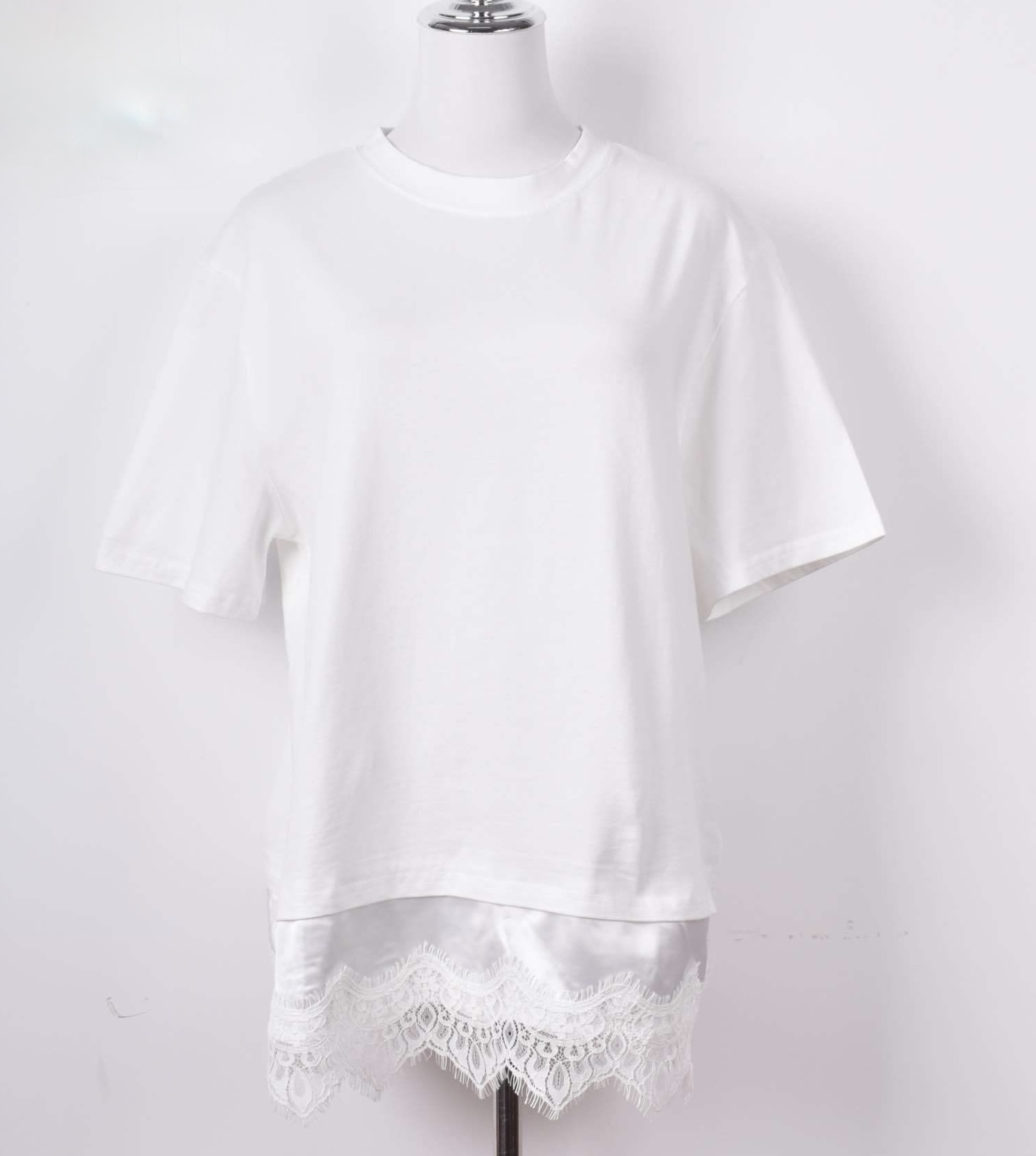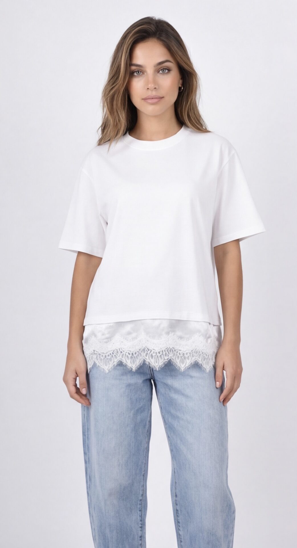 T-shirt Flavia. T-shirt blanc bas dentelle. Minimaliste au premier regard, délicatement sophistiqué dans le détail, le t-shirt Flavia revisite un essentiel du dressing avec féminité. Sa coupe droite et confortable en coton doux offre un tombé naturel qui accompagne le mouvement sans marquer la silhouette. Facile à porter au quotidien, ce t-shirt s’intègre immédiatement dans toutes les garde-robes.