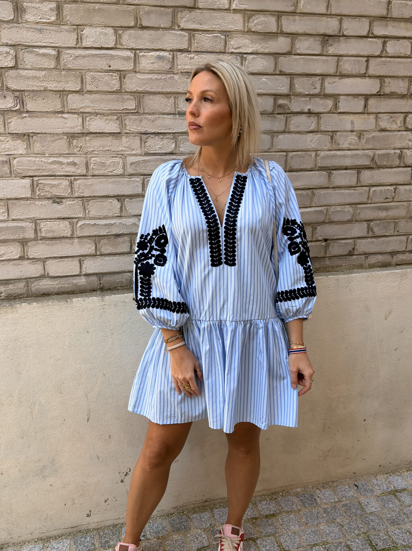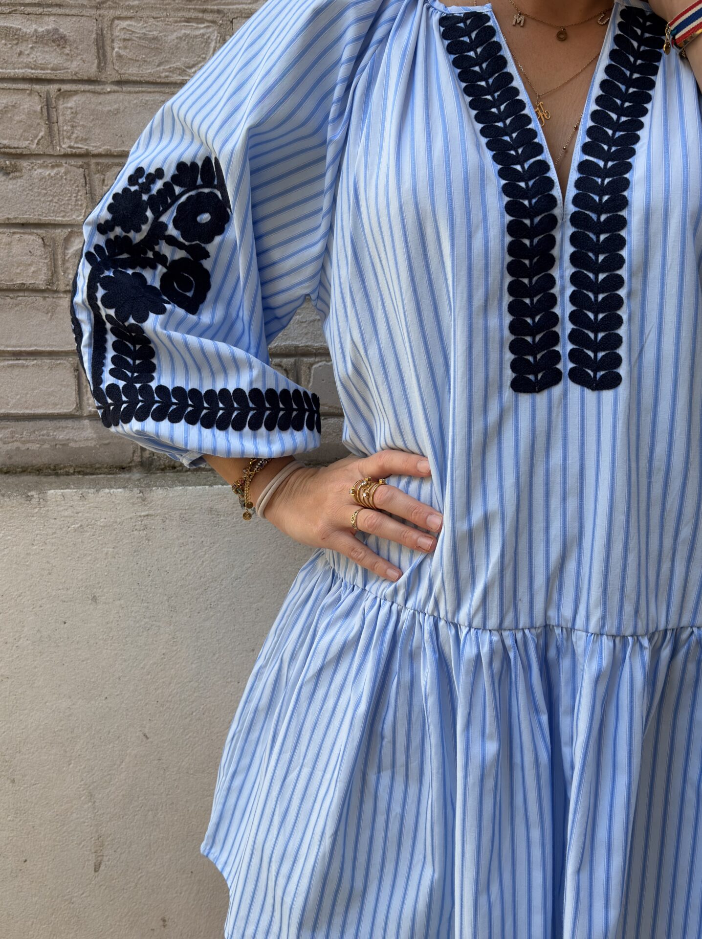 Découvrez Kate, une pièce incontournable qui allie fraîcheur et élégance avec une touche bohème chic. Cette robe à rayures avec broderie séduit dès le premier regard par son style raffiné et ses détails travaillés. Confectionnée dans une matière légère et agréable à porter, elle se distingue par ses fines rayures bleues qui allongent la silhouette, ainsi que par ses broderies contrastantes qui apportent du caractère et une véritable signature mode. Idéale pour les beaux jours, elle incarne parfaitement l’équilibre entre confort et tendance.