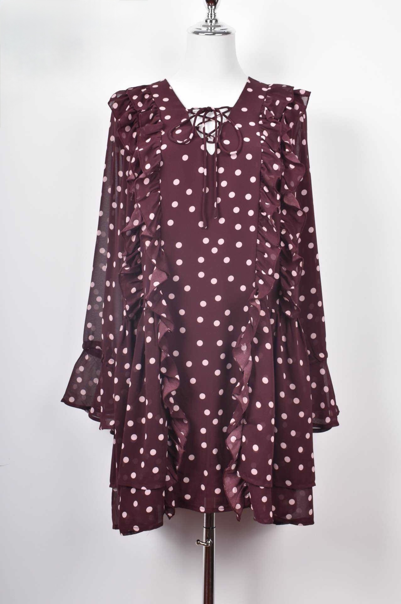 Robe Emilianna, robe fluide, à pois, volants : cette pièce incarne parfaitement la féminité moderne avec une touche romantique et élégante. Son coloris bordeaux profond est sublimé par de délicats pois rose clair qui illuminent la silhouette tout en restant raffinés. L’équilibre entre la teinte intense et la douceur du motif crée une allure chic, idéale pour celles qui aiment les pièces qui attirent le regard sans être excessives.